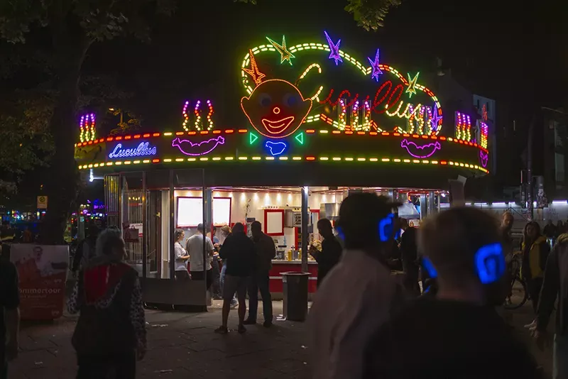 Der Kult-Imbiss auf der Reeperbahn erstrahlt mit seiner auffälligen LED-Beleuchtung wie ein Magnet für hungrige Nachtschwärmer. Hier finden Sie eine verlockende Auswahl von Thüringer Würsten, Currywurst und knusprigen Pommes – ein unverzichtbarer Zwischenstopp auf Ihrer Reeperbahn-Nacht.