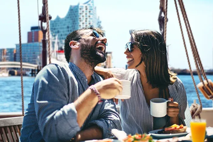 Mit der sonntäglichen Brunchfahrt ermöglicht die Mare Frisium Hamburger:innen und Besucher:innen der Hansestadt eine unvergessliche Auszeit auf der Elbe: Während des vierstündigen Segeltörns gleitet der Windjammer ab den Landungsbrücken entlang der Waterkant bis raus nach Blankenese, wobei die Elbphilharmonie, der Hafen, der Elbstrand sowie das einzigartige Treppenviertel und die historischen Villen begutachtet werden können. Aus der Kombüse bereitet das Küchen-Team in der Zeit ein vielfältiges Brunchbuffet, welches für jeden Geschmack hausgemachte warme und kalte Speisen offeriert: Von Müsli und Marmeladen mit Gebäck aus der hauseigenen Steinofenmanufaktur über Nürnberger Würstchen, Räucherlachs und Vierländer Tomaten bis Fruchtsmoothies zum Dessert – das regionale & saisonale Angebot wird durch die Auswahl an Soft- und Heißgetränken von der Bar perfekt abgerundet. Gestärkt kann sich an Deck entspannt und die Nordseebrise genossen werden. Bis die Crew ruft – dann darf beim Segel setzen mit angepackt und so einiges über das Segelhandwerk gelernt werden!